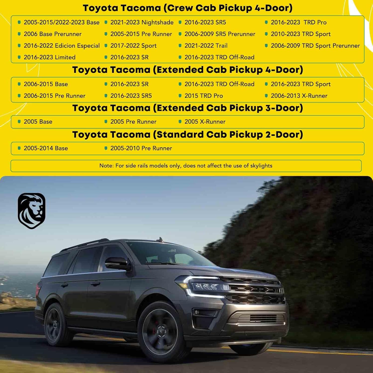 Compatible Vehicle: YHTAUTO Side Roof Rails Cross Bars fits for Toyota Tacoma 2005-2023 (Not For Regular Cab And Not For Access Cab). Please see more vehicle fitment on the Amazon Garage to ensure that the right product is purchased